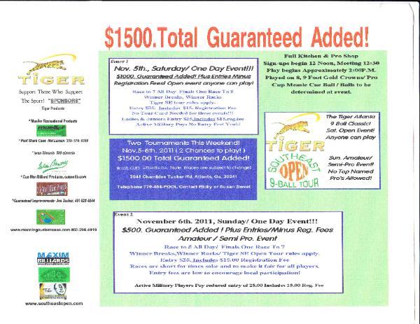 November 5th - 6th come out and play in the Tiger southeast open 9-ball tournament. See flyer below for more details. See ya soon!